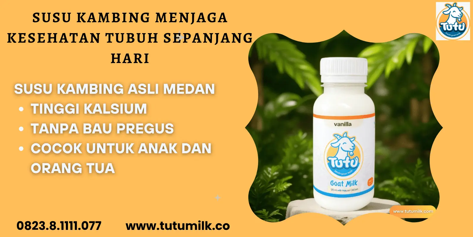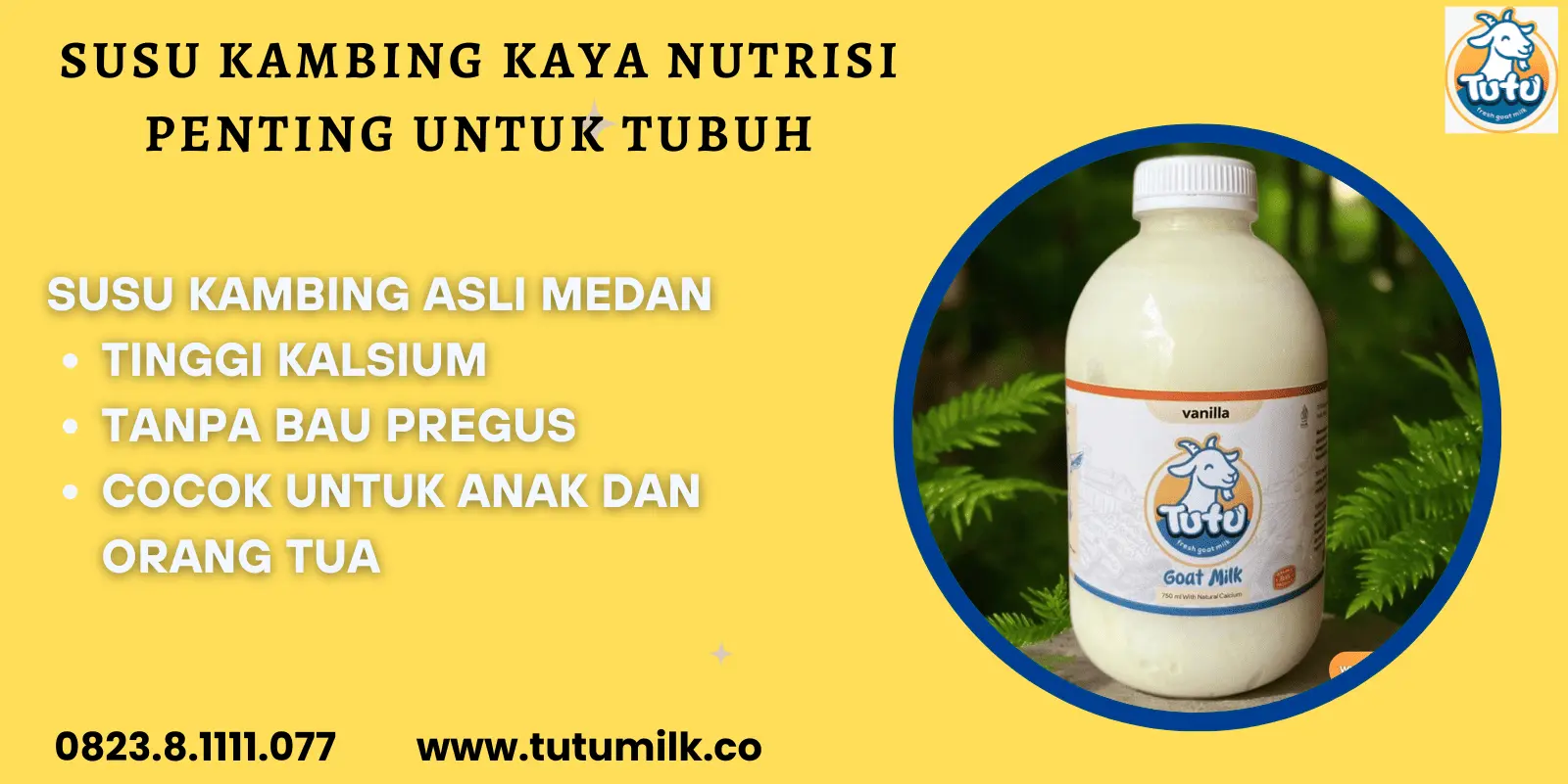 Nikmati TUTU Susu Kambing 125ml, kaya kalsium untuk kesehatan tulang, mendukung pencernaan, dan meningkatkan daya tahan tubuh. Cocok untuk semua usia, termasuk yang intoleran laktosa. Tersedia dalam berbagai varian rasa yang segar, TUTU adalah pilihan tepat untuk gaya hidup sehat.